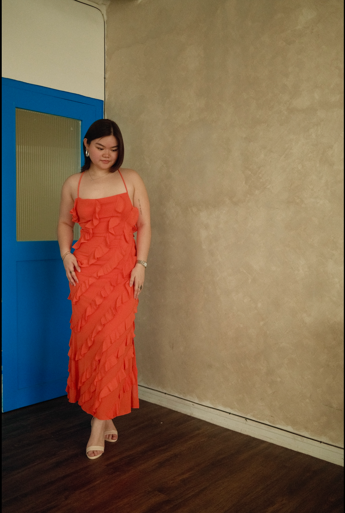 The fitted bodice and cascading texture of this dress create a bold yet elegant silhouette, ideal for summer events, destination weddings, or evening wear.